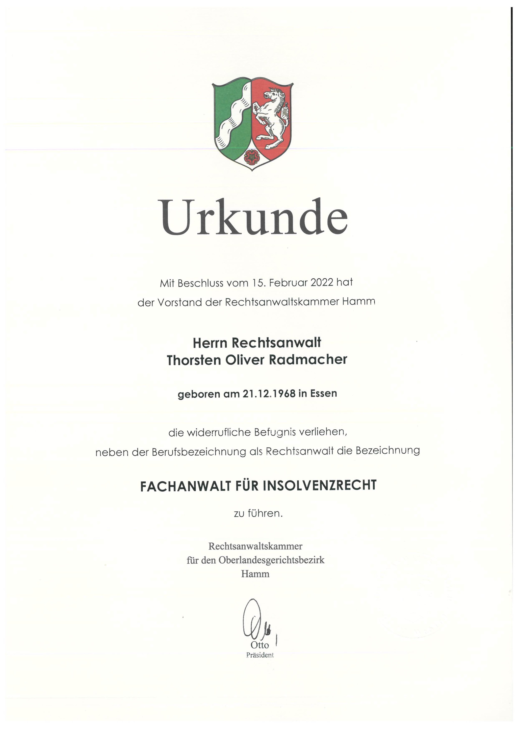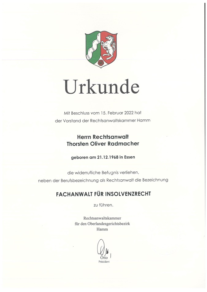 Im Jahre 2011 absolvierte Herr Rechtsanwalt Radmacher erfolgreich den Fachanwaltslehrgang Insolvenzrecht in Frankfurt am Main und wurde 2012 vom AG Essen zum Treuhänder und Insolvenzverwalter ernannt.